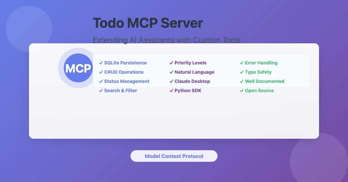 The Todo MCP server demonstrates how to build a practical, production-ready MCP server that extends AI assistant capabilities. By following the Model Context Protocol specification and implementing robust database operations, this server provides a solid foundation for task management through AI assistants. The project showcases best practices in MCP server development, including proper error handling, comprehensive testing, and clear documentation.